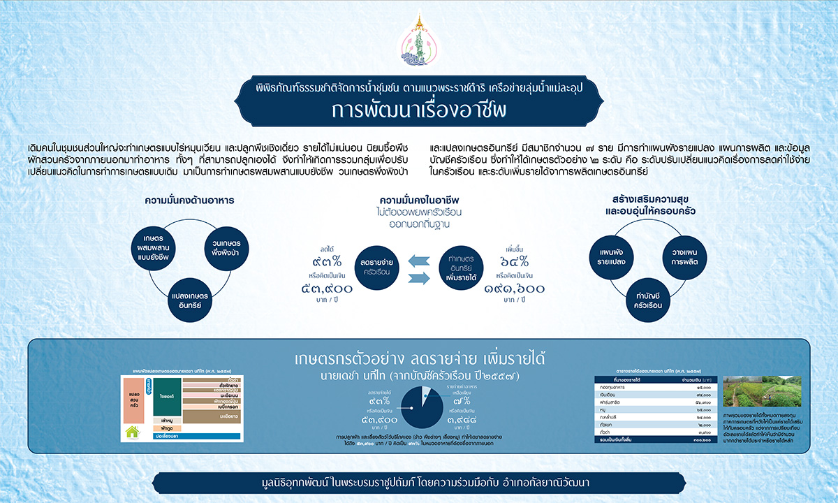 เศรษฐกิจพอเพียงเป็นเครื่องมือสำคัญต่อการพัฒนาอย่างยั่งยืน การเรียนรู้ระบบบริหารจัดการน้ำเป็นปัจจัยสำคัญ มีข้อมูล ความรู้ หลักวิทยาศาสตร์และความเป็นเหตุเป็นผล น้อมนำปรัชญาเศรษฐกิจพอเพียงสู่การปฏิบัติ ด้วยหลัก เข้าใจ เข้าถึง พัฒนา ทํางานเป็นเครือข่ายขยายผลสําเร็จ เพิ่มทักษะความรู้ จัดการความรู้ ร่วมกับภูมิปัญญา จัดเก็บข้อมูล วิเคราะห์อย่างมีหลักการ และนำไปสู่การลงมือปฏิบัติจริง ใช้ข้อมูล ใช้วิทยาศาสตร์และเทคโนโลยี ใช้แผนที่ ร่วมกับการเปลี่ยนแปลงสภาพภูมิอากาศ เปลี่ยนชีวิต สร้างภูมิคุ้มกันให้สามารถจัดการทรัพยากรธรรมชาติ ลดความเสี่ยงจากภัยพิบัติ นําไปสู่เป้าหมายการพัฒนาที่ยั่งยืน